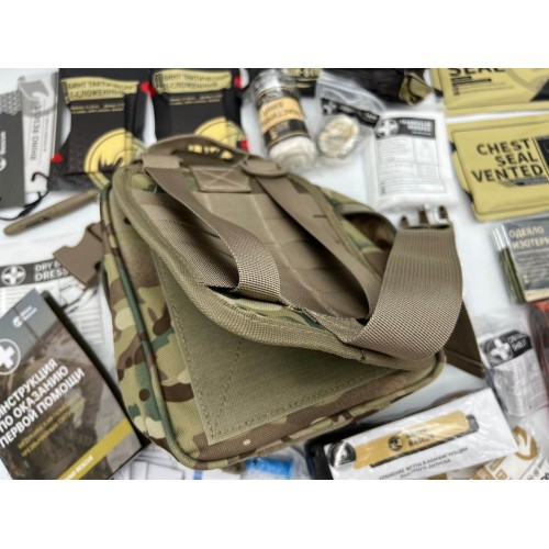 - Цвет и дизайн: Аптечка выполнена в расцветке "мультикам", что позволяет ей сливаться с тактической амуницией и снаряжением.