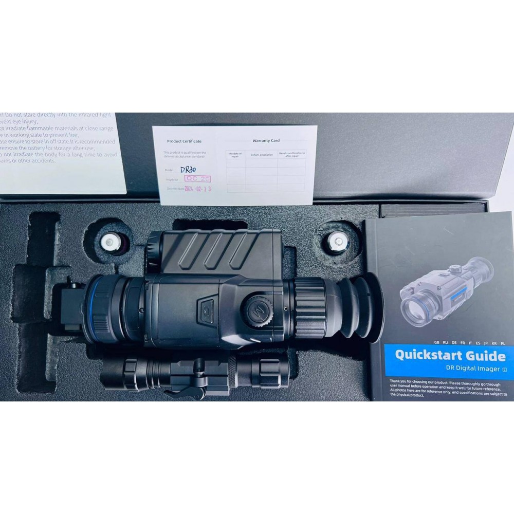 Guide DR30 — это высокопрофессиональный прицел ночного видения, способный работать и в дневное время. Он оснащён продвинутым CMOS-сенсором с разрешением 1920x1080@4μm и 35-миллиметровым объективом, что обеспечивает чёткость изображения и широкое угловое поле зрения — 12,52°x7,06°. Качественный Full HD дисплей с разрешением 1920x1080 позволяет комфортно просматривать изображения. Питание устройства осуществляется от сменного литий-ионного аккумулятора 18650, который может работать до 6 часов, в зависимости от режима использования.